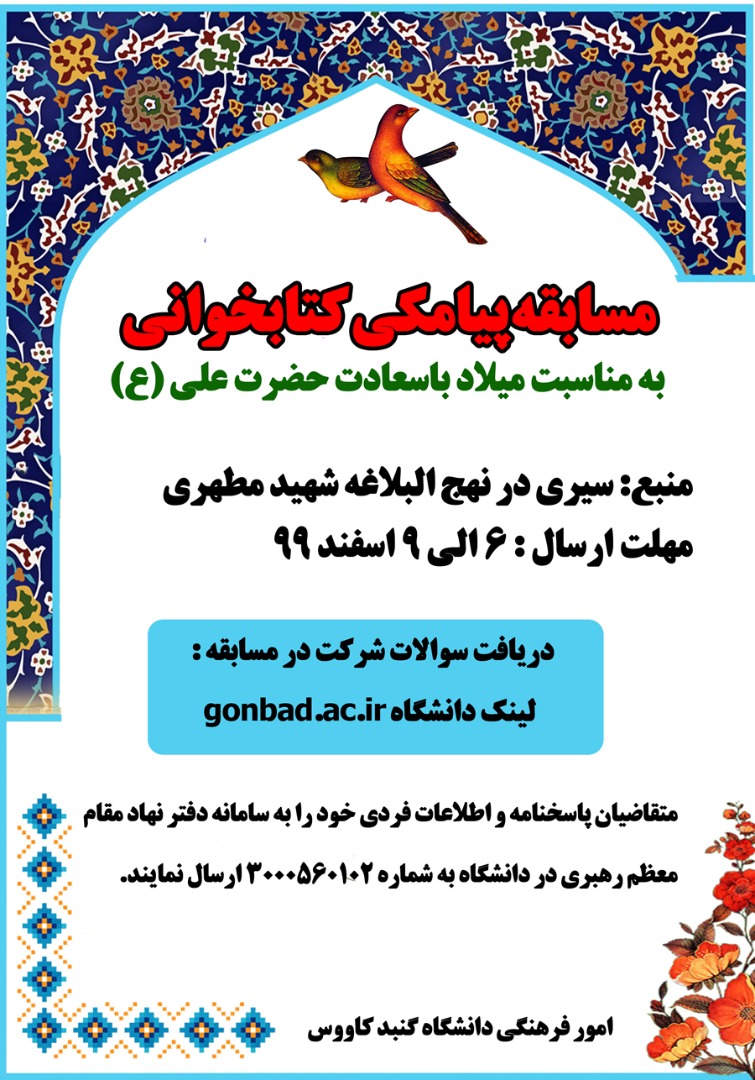 منبع: سیری در نهج البلاغه استاد شهید مطهری - مهلت ارسال پاسخ: 6 الی 9 اسفند سال 1399 - به برندگان این مسابقه به قید قرعه جوایز نفیسی اهدا میشود.