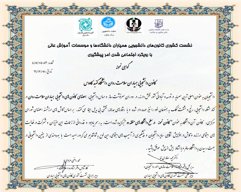 کسب عنوان کانون دانشجویی برتر در سطح دانشگاه های منطقه دو کشور توسط کانون دانشجویی همیاران سلامت روان دانشگاه گنبد کاووس