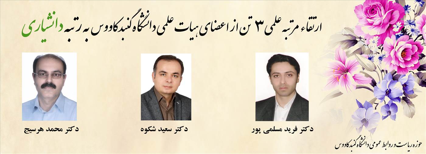 ارتقاء رتبه علمی آقایان، دکتر محمد هرسیج و دکتر فرید مسلمی پور (اعضای هیات علمی دانشکده علوم کشاورزی و منابع طبیعی)و دکتر سعید شکوه، عضو هیات علمی دانشکده علوم پایه و فنی مهندسی دانشگاه گنبدکاووس به مرتبه دانشیاری.