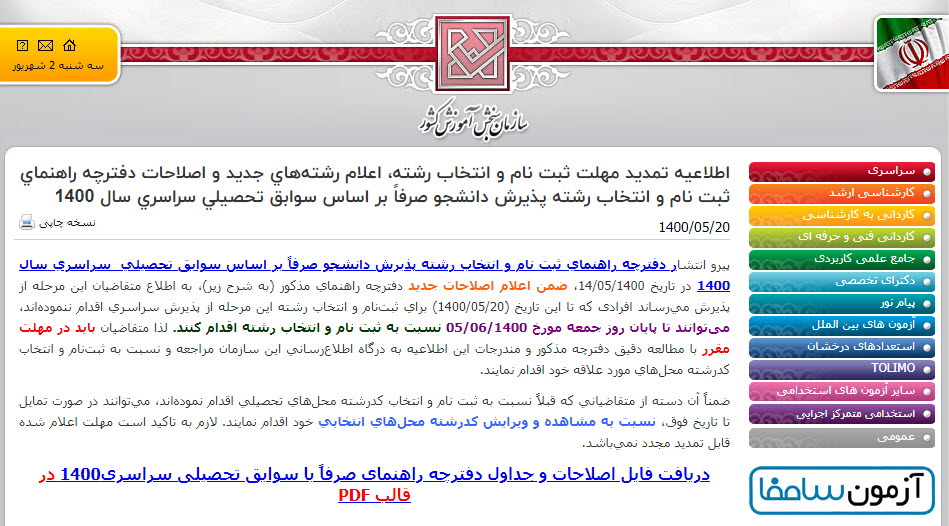 پيرو انتشار دفترچه راهنماي ثبت نام و انتخاب رشته پذيرش دانشجو صرفاً بر اساس سوابق تحصيلي سراسري سال 1400 در تاريخ 1400/05/14، ضمن اعلام اصلاحات جديد دفترچه راهنماي مذکور (به شرح زير)، به اطلاع متقاضيان این مرحله از پذيرش ميرساند افرادی كه تا اين تاريخ (1400/05/20) براي ثبتنام و انتخاب رشته اين مرحله از پذيرش سراسري اقدام ننمودهاند، میتوانند تا پايان روز جمعه مورخ 1400/06/05 نسبت به ثبت نام و انتخاب رشته اقدام کنند. لذا متقاضيان باید در مهلت مقرر با مطالعه دقيق دفترچه مذکور و مندرجات این اطلاعيه به درگاه اطلاعرساني اين سازمان مراجعه و نسبت به ثبتنام و انتخاب كدرشته محلهاي مورد علاقه خود اقدام نمايند.