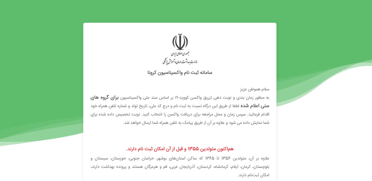 سامانه ثبت نام واکسیناسیون کرونا برای دانشجویان و طلاب از هم اکنون باز شد و دانشجویان زیر مجموعه وزارت علوم، وزارت بهداشت، دانشگاه آزاد و طلاب حوزههای علمیه سراسر کشور میتوانند به سایت salamat.gov.ir مراجعه و با ورود کد ملی، تاریخ تولد و شماره همراه ثبت نام و بلافاصله زمان و مکان تزریق واکسن را انتخاب کنند.
