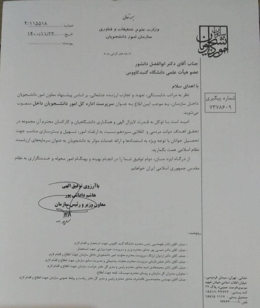 انتصاب جناب آقای دکتر ابوالفضل دانشور، عضو هیات علمی دانشگاه گنبدکاووس، بعنوان سرپرست اداره کل امور دانشجویان داخل، سازمان امور دانشجویان کشور