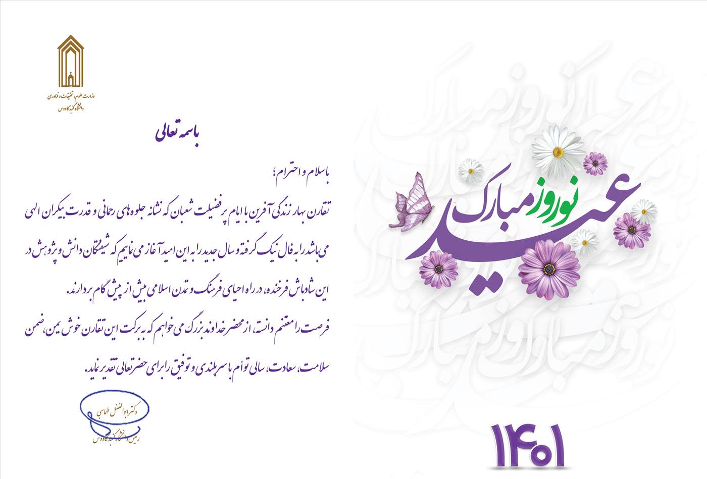 تقارن بهار زندگی آفرین با ایام پرفضیلت شعبان که نشانه جلوههای رحمانی و قدرت بیکران الهی میباشد را به فال نیک گرفته و سال جدید را به این امید آغاز مینماییم که شیفتگان دانش و پژوهش در این شادباش فرخنده، در راه احیای فرهنگ و تمدن اسلامی بیش از پیش گام بردارند.