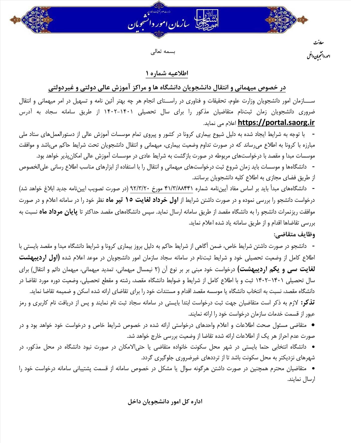 داﻧﺸﺠﻮﯾﺎن ﮔﺮاﻣﯽ ﻣﺘﻘﺎﺿﯽ ﻣﯿﻬﻤﺎﻧﯽ واﻧﺘﻘﺎل در ﺳﺎل ﺗﺤﺼﯿﻠﯽ 1402- 1401 ﻻزم اﺳﺖ ﺿﻤﻦ ﻣﻄﺎﻟﻌﻪ دﻗﯿﻖ آﯾﯿﻦ ﻧﺎﻣﻪ ﻧﻘﻞ واﻧﺘﻘﺎل و رﻋﺎﯾﺖ ﻣﻔﺎد آن ، ﻣﻨﺤﺼﺮا ازﺗﺎرﯾﺦ 1401/02/01 ﻟﻐﺎﯾﺖ 1401/02/31 ﺑﺎﻣﺮاﺟﻌﻪ ﺑﻪ ﺳﺎﻣﺎﻧﻪ ﺳﺠﺎد وزارت ﻋﻠﻮم ،ﺗﺤﻘﯿﻘﺎت وﻓﻨﺎوري ﺑﻪ ﻧﺸﺎﻧﯽ ((https://portal.saorg.ir درﺧﻮاﺳﺖ ﺧﻮد راﺛﺒﺖ ﻧﻤﺎﯾﻨﺪ.ﻻزم ﺑﻪ ذﮐﺮ اﺳﺖ راﻫﻨﻤﺎي ﺛﺒﺖ ﻧﺎم وﺛﺒﺖ درﺧﻮاﺳﺖ ﻣﯿﻬﻤﺎﻧﯽ ﻧﯿﺰ درﺳﺎﻣﺎﻧﻪ ﻣﺬﮐﻮر ﻗﺎﺑﻞ دﺳﺘﺮس می باشد.