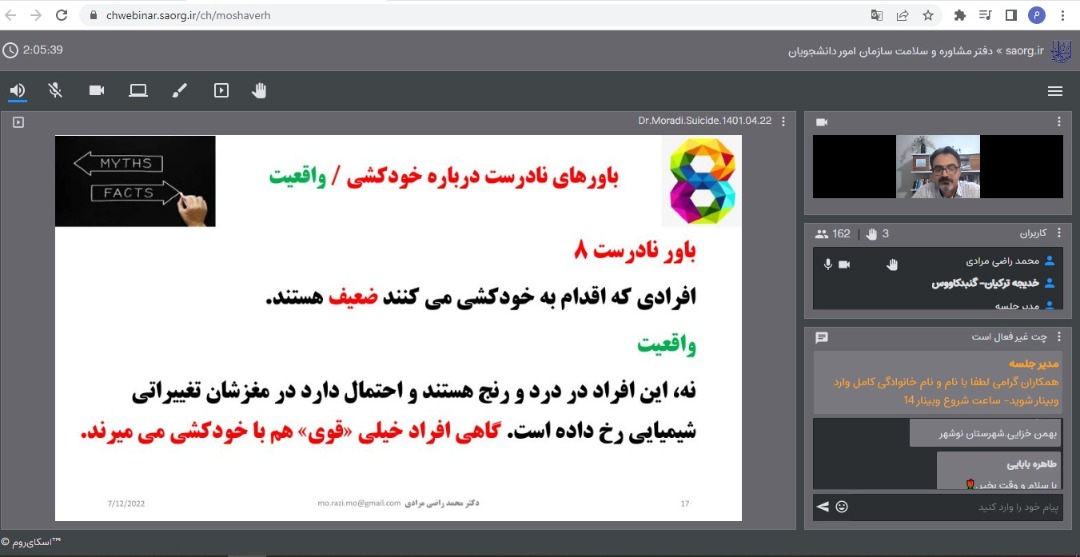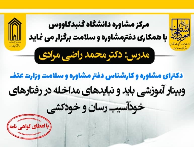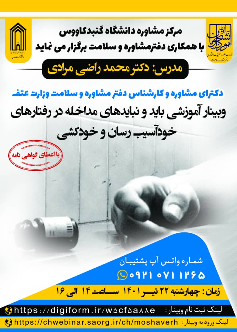 کارگاه باید و نبایدهای مداخله در رفتارهای خودآسیب رسان و خودکشی در تاریخ 22 تیر 1401، به ميزباني دانشگاه گنبدكاووس و با سخنراني دكتر محمد راضي مرادي، دكتري مشاوره و كارشناس دفتر مشاوره و سلامت وزارت، با همکاری دفتر مشاوره و سلامت وزارت علوم، تحقیقات و فناوری و مرکز مشاوره دانشگاه گنبدکاووس ویژه روانشناسان و مشاوران دانشگاه های و موسسات آموزش عالي سراسرکشور برگزار شد.