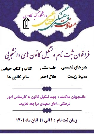 دانشجویان گرامی جهت ثبت نام و تشکیل کانونهای دانشجویی در ساعات اداری به کارشناس امور فرهنگی جناب آقای سعیدی مراجعه نمایید.