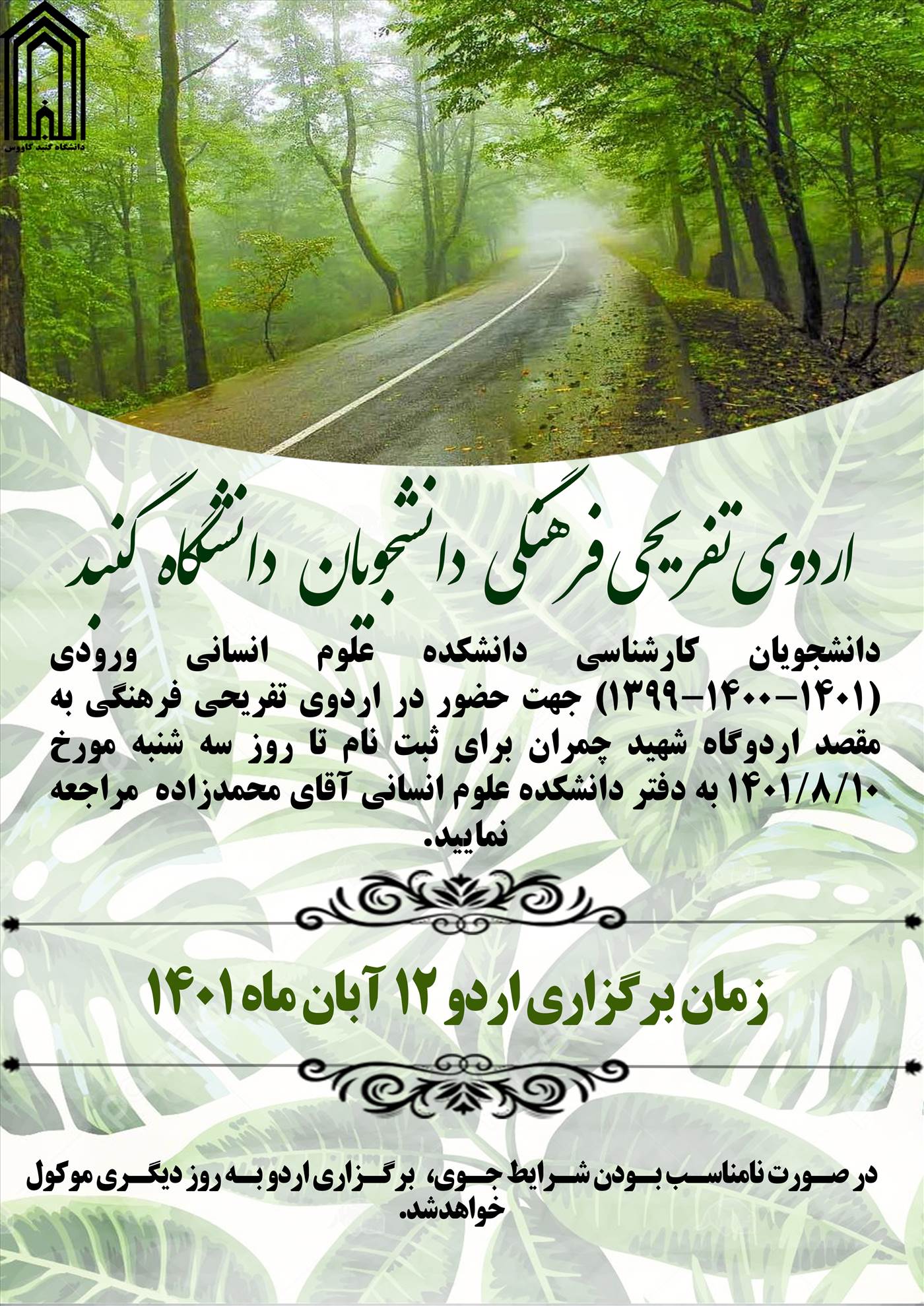 ( قابل توجه دانشجویان دانشکده علوم انسانی و علوم ورزشی)زمانبندی برگزاری اردوی تفریحی فرهنگی نودانشجویان دانشگاه گنبدکاووس
