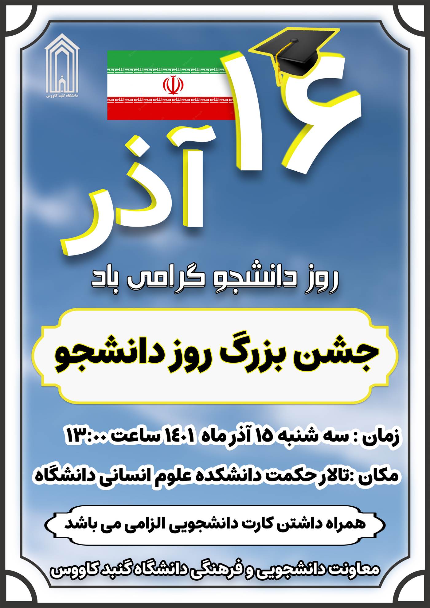 جشن بزرگ روز دانشجو به مناسبت 16 آذرماه گرامیداشت روز دانشجو. زمان: سه شنبه 1401/09/15 ساعت 13.