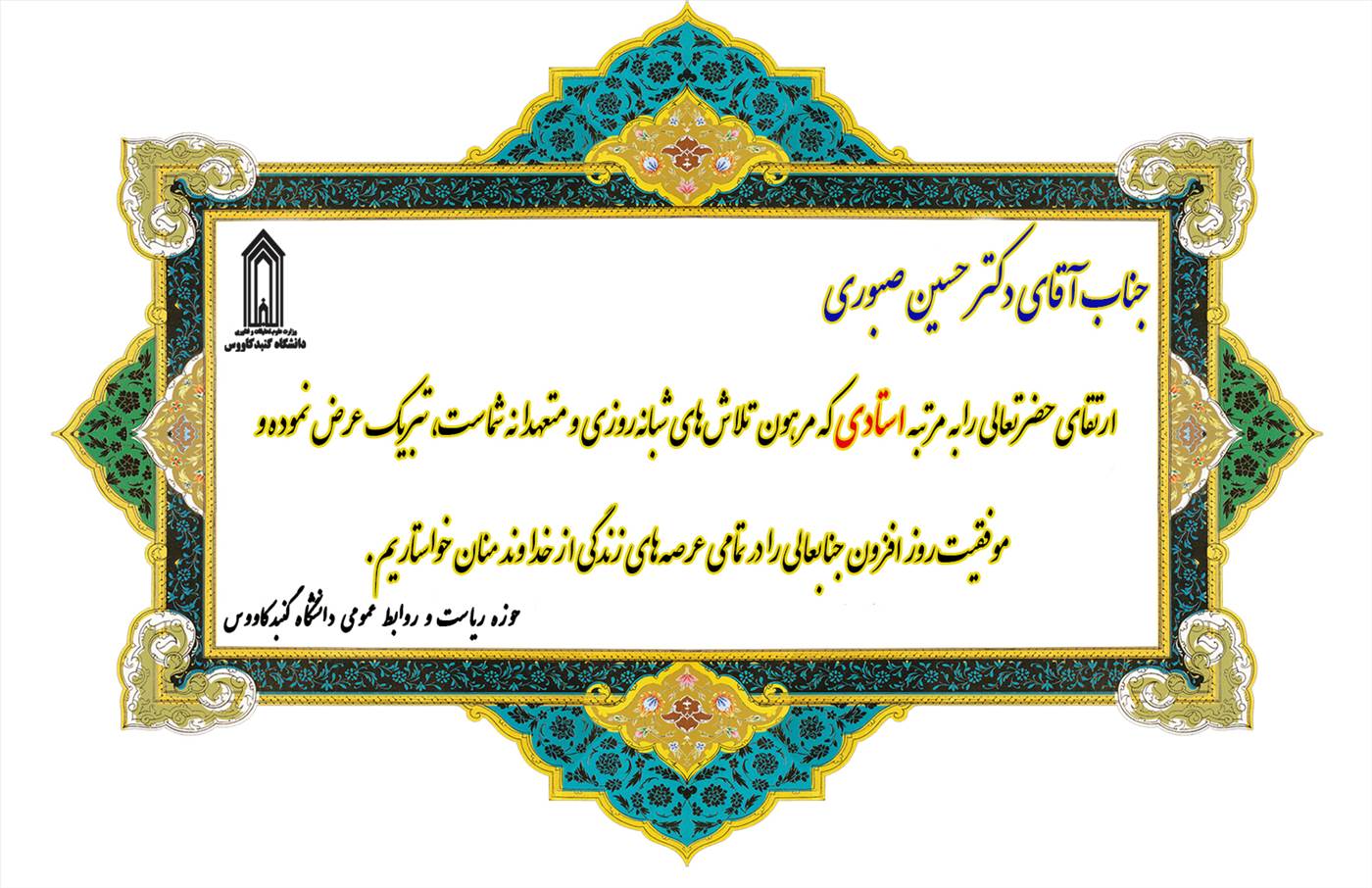 جناب آقای دکتر حسین صبوری؛ ارتقای علمی حضرتعالی را به مرتبه استادی که مرهون تلاشهای شبانهروزی و متعهدانه شماست، تبریک عرض نموده و موفقیت روزافزون جنابعالی را در تمامی عرصههای زندگی از خداوند منان خواستاریم.