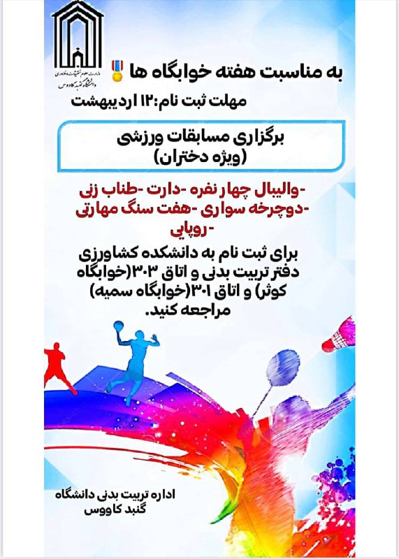 جهت ثبت نام به دانشکده کشاورزی، دفتر تربیت بدنی و اتاق 303 (خوابگاه کوثر) و اتاق 301 (خوابگاه سمیه) مراجعه نمایید.