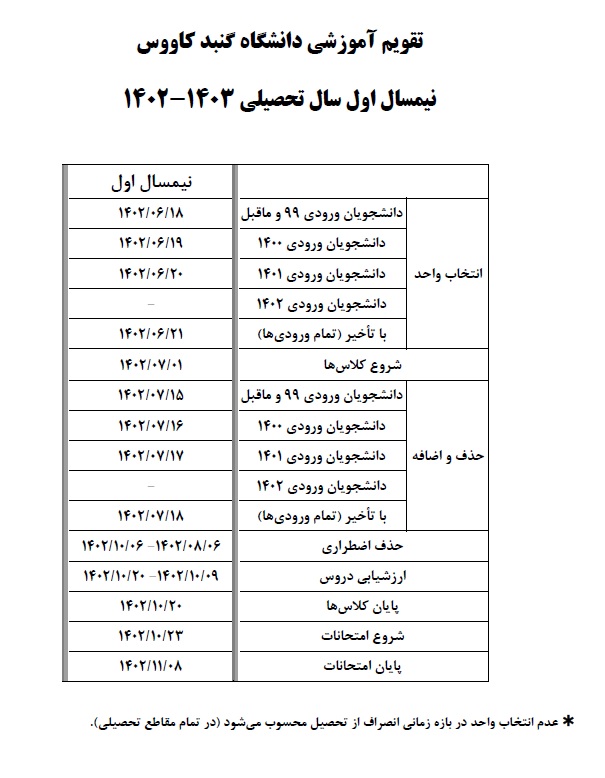 تقویم آموزشی دانشگاه گنبد کاووس نیمسال اول سال تحصیلی 1403-1402