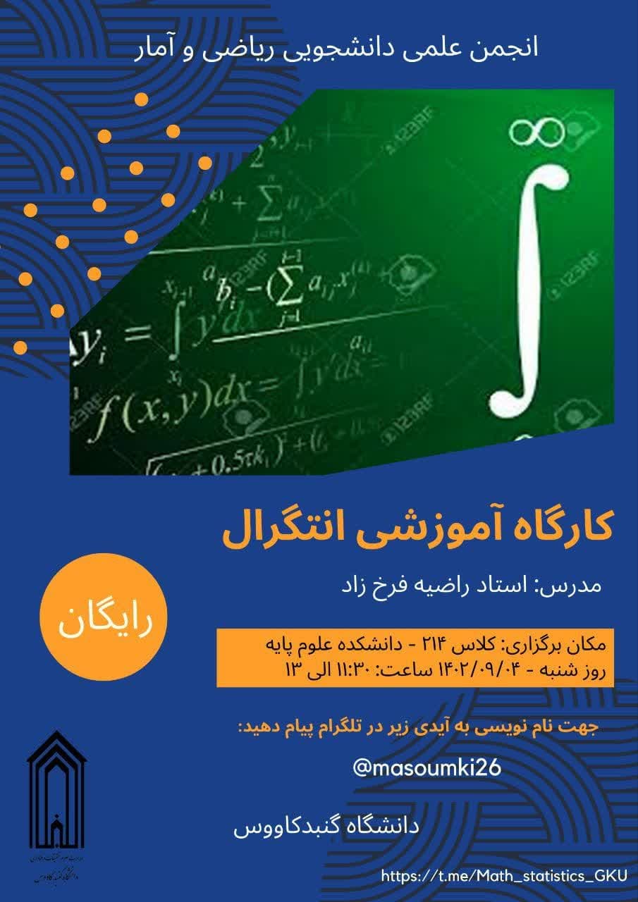 کارگاه آموزشی انتگرال مدرس: استاد راضیه فرخ زاد مکان: کلاس ۲۱۴ - دانشکده علوم پایه زمان: شنبه ۱۴۰۲/۰۹/۰۴ - ساعت: ۱۱:۳۰ تا ۱۳