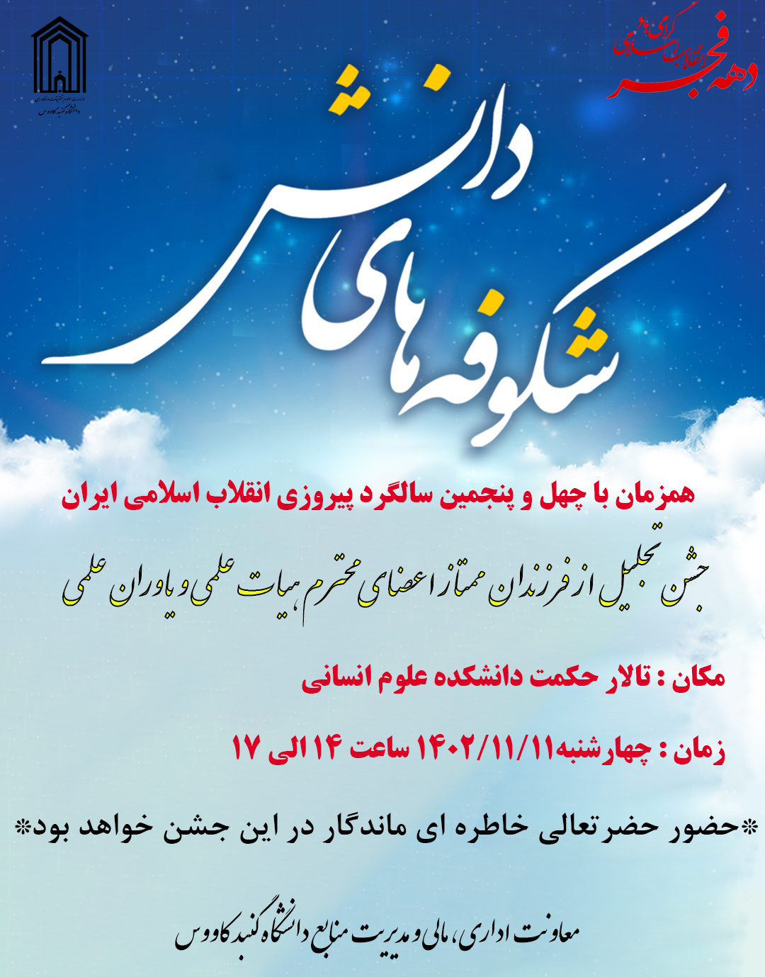 همزمان با چهل و پنجمین سالگرد پیروزی انقلاب اسلامی ایران مراسم جشن تجلیل از فرزندان ممتاز اعضای محترم هیات علمی و ویاوران علمی در دانشگاه گنبدکاووس برگزار می گردد .