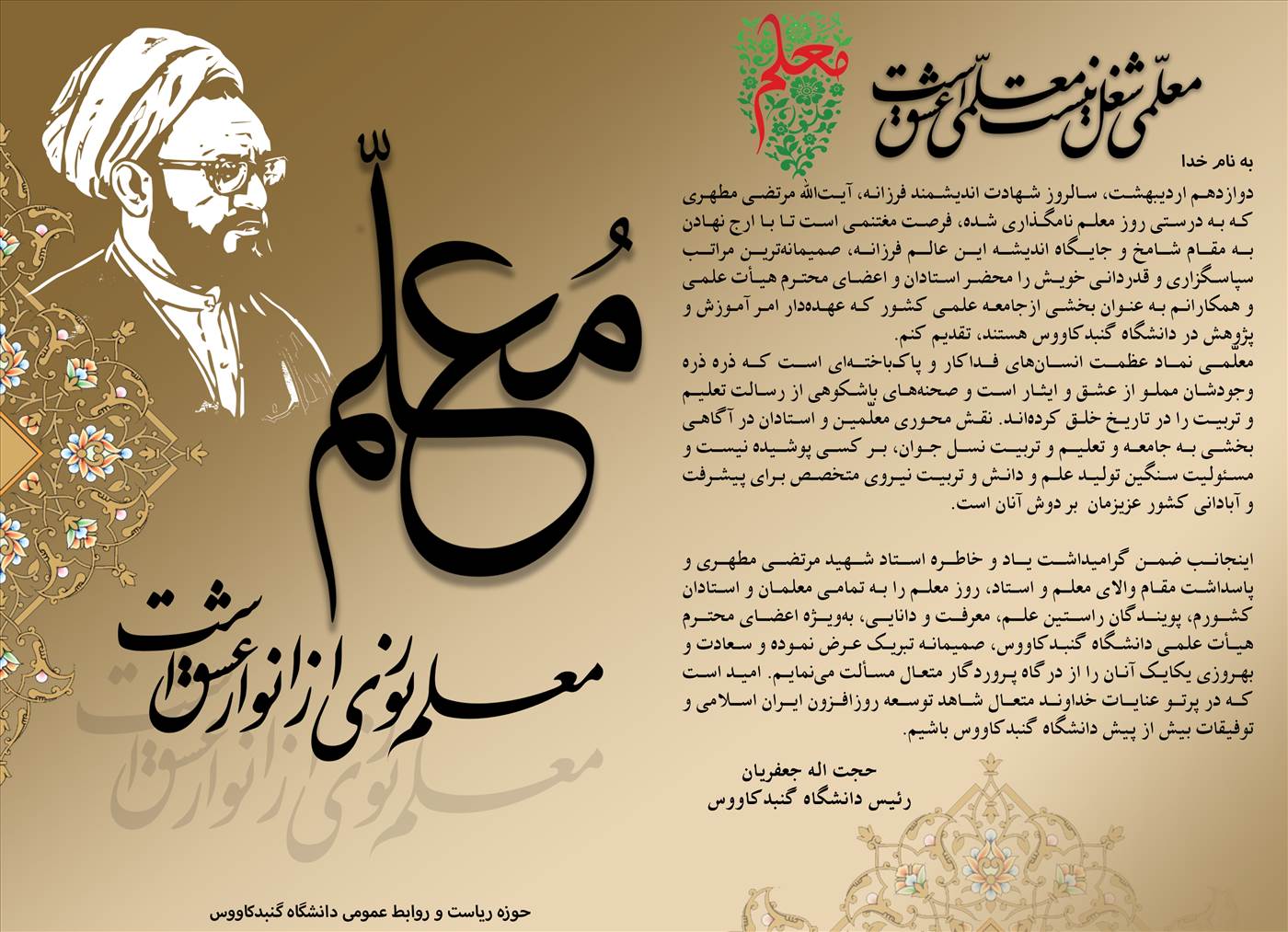 اینجانب ضمن گرامیداشت یاد و خاطره استاد شهید مرتضی مطهری و پاسداشت مقام والای معلم و استاد، روز معلم را به تمامی معلمان و استادان کشورم، پویندگان راستین علم، معرفت و دانایی، بهویژه اعضای محترم هیأت علمی دانشگاه گنبدکاووس، صمیمانه تبریک عرض نموده و سعادت و بهروزی یکایک آنان را از درگاه پروردگار متعال مسألت مینمایم. امید است که در پرتو عنایات خداوند متعال شاهد توسعه روزافزون ایران اسلامی و توفیقات بیش از پیش دانشگاه گنبدکاووس باشیم.