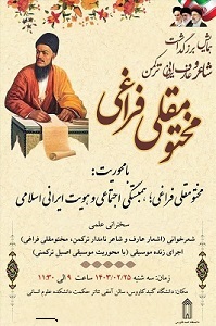 برگزاری همایش بزرگداشت شاعر و عارف نامدار ایرانی ترکمن مختومقلی فراغی به میزبانی دانشگاه گنبدکاووس در روز سه شنبه مورخ 1403/02/25 ساعت 9 الی 11:30 واقع در تالار حکمت دانشکده علوم انسانی دانشگاه گنبدکاووس