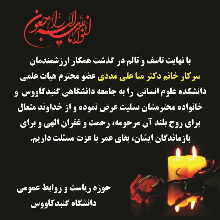 درگذشت همکار ارزشمندمان سرکار خانم دکتر منا علی مددی عضو محترم هیات علمی دانشکده علوم انسانی را به جامعه دانشگاهی گنبدکاووس تسلیت عرض می نماییم.