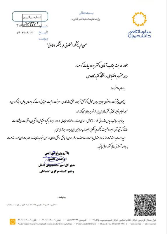 تقدیر جناب آقای دکتر ابوالفضل دانشور مدیرکل امور دانشجویان داخل و دبیر کمیته مرکزی انضباطی از رئیس دفتر انضباطی دانشگاه گنبد کاووس