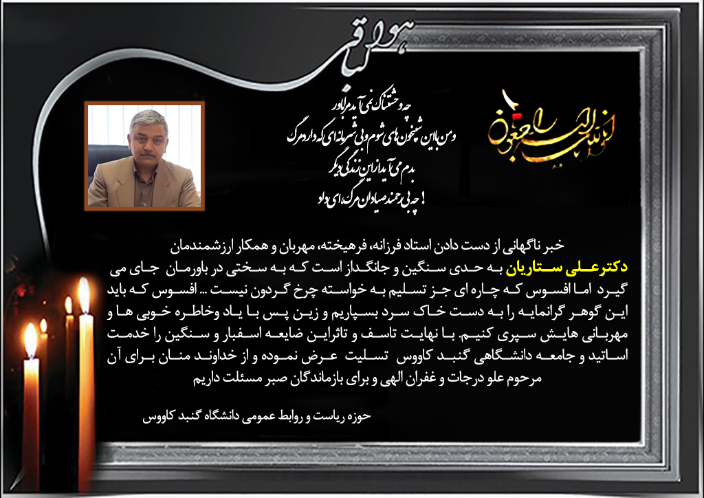 خبرناگهانی ازدست دادن استادفرزانه،فرهیخته، مهربان و همکارارزشمندمان دکترعلی ستاریان به حدی سنگین و جانگداز است که به سختی در باورمان جای می گیرد اما افسوس که چاره ای جز تسلیم به خواسته چرخ گردون نیست ...افسوس که بایداین گوهر گرانمایه را به دست خاک سرد بسپاریم وزین پس با یاد وخاطره خوبی ها و مهربانی هایش سپری کنیم. بانهایت تاسف وتاثراین ضایعه اسفبار وسنگین را خدمت اساتید وجامعه دانشگاهی گنبد کاووس تسلیت عرض نموده واز خداوندمنان برای آن مرحوم علودرجات وغفران الهی وبرای بازماندگان صبر،مسئلت داریم.