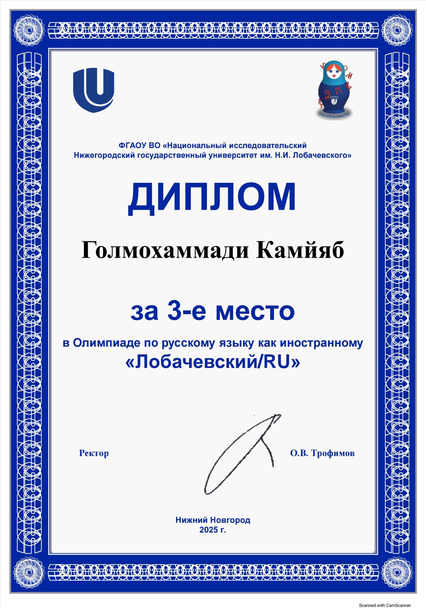 جناب آقای کامیاب گل محمدی دانشجوی ترم هشتم رشته زبان روسی این دانشگاه موفق شد در این المپیاد به مقام سوم دست پیدا کند. لازم به ذکراست به برندگان المپیاد سهمیه بورس تحصیلی از طرف دانشگاه  لوباچفسکی در مقطع کارشناسی ارشد اعطا می‌شود.