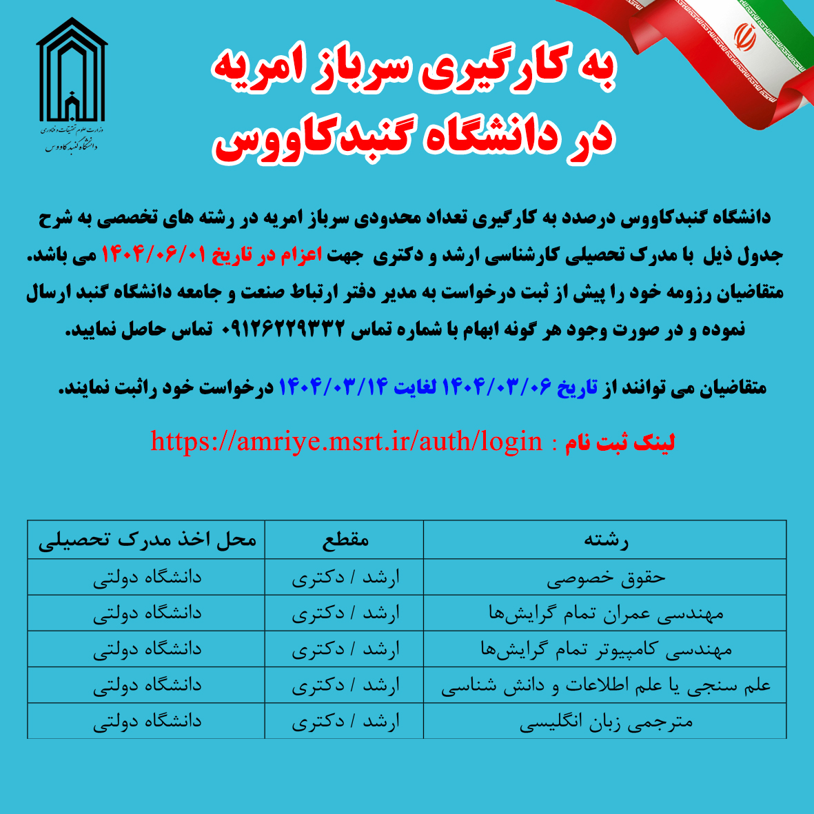 دانشگاه گنبدکاووس با اخذ مجوز به کارگیری تعداد محدودی نیروی امریه در رشته های تخصصی به شرح جدول ذیل در سال 1404 اقدام به جذب و به کارگیری نیروهای متخصص و نخبه با مدرک تحصیلی کارشناسی ارشد و دکتری جهت اعزام در تاریخ 1404/06/01 کرده است. متقاضیان می توانند از تاریخ 1404/03/06 لغایت 1404/03/14 درخواست خود راثبت نمایند.