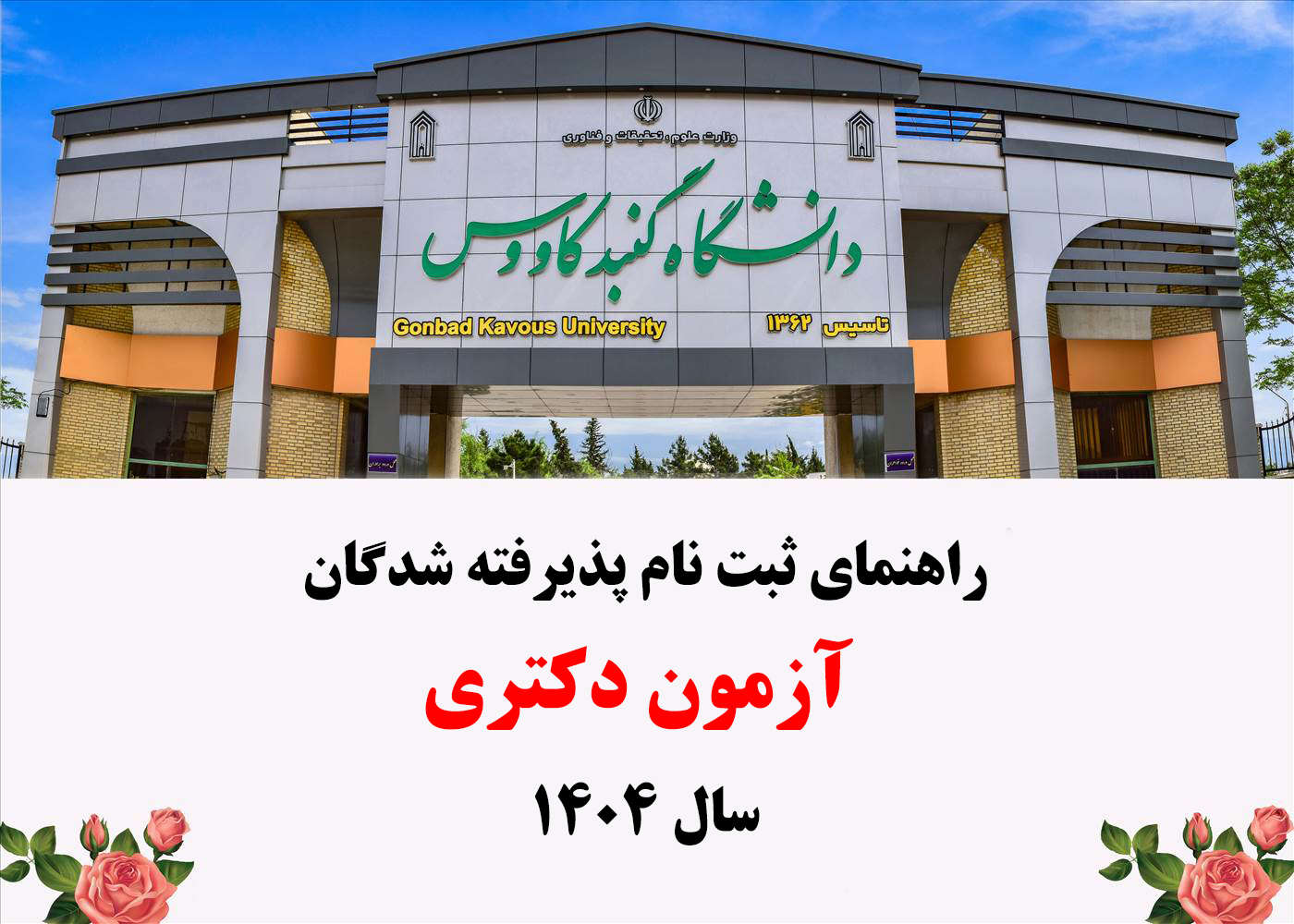 ضمن عرض تبریک به دانشجویان نو ورود که در مقطع دکتری تخصصی دانشگاه گنبدکاووس پذیرفته شدهاند، به استحضار میرساند فرآیند ثبتنام غیرحضوری (اینترنتی/آنلاین) از روز شنبه مورخ 1404/06/22 لغایت سه شنبه 1404/06/25 انجام خواهد شد.