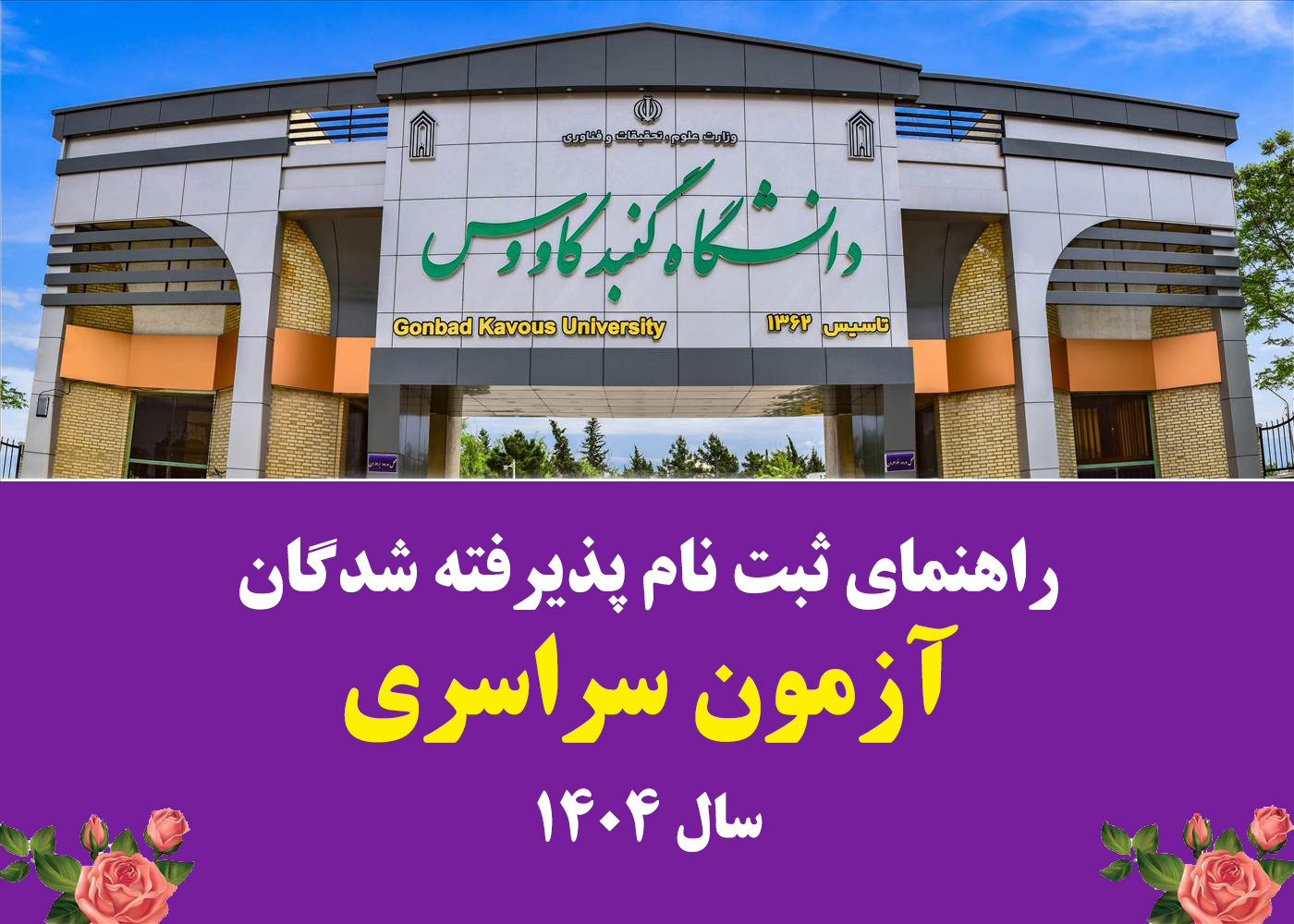 ضمن تبریک به پذيرفتهشدگان رشتههای مختلف تحصيلی آزمون سراسری سال 1404 دانشگاه گنبد کاووس، به اطلاع می رساند فرایند ثبت نام بصورت غیرحضوری (اینترنتی) و با مراجعه به سامانه جامع دانشگاه به آدرس https://gonbad.ac.ir/ انجام خواهد شد. لازم به ذکر است ثبت نام غیرحضوری مطابق فایل راهنما که در اطلاعیه شماره 2 از طریق وب سایت دانشگاه در دسترس پذیرفته شدگان قرار خواهدگرفت امکان پذیر خواهد بود، مقتضی است پذیرفتهشدگان محترم نسبت به مطالعه دقیق راهنما و ثبتنام غیرحضوری اقدامات لازم را انجام دهند.