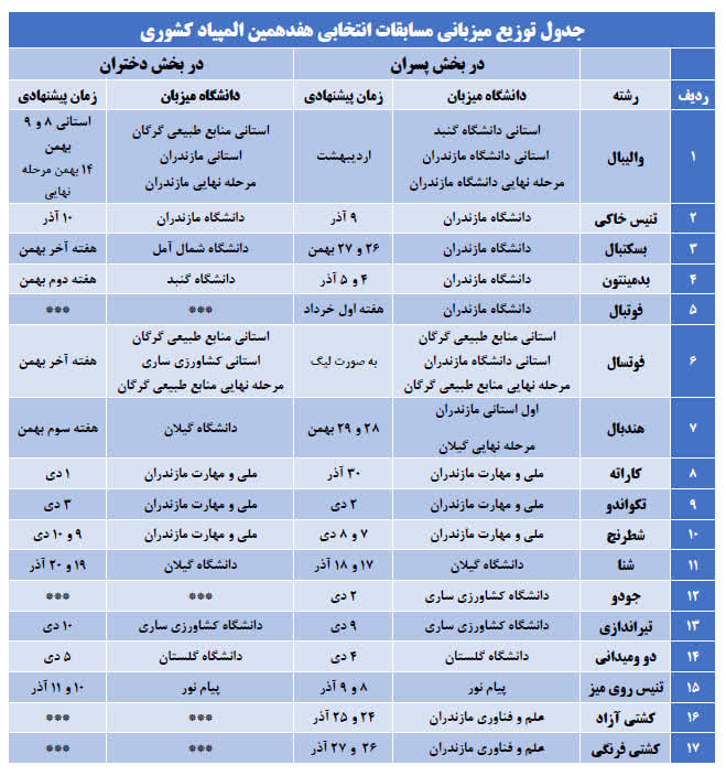 🔹 جدول توزیع میزبانی مسابقات انتخابی هفدهمین المپیاد کشوری به شرح ذیل می‌باشد.