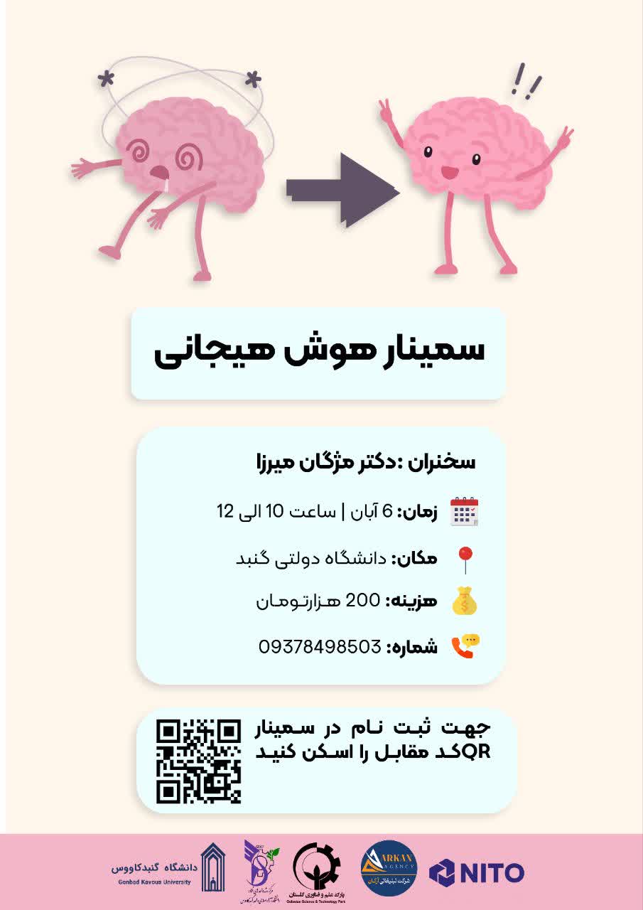 برگزاری دوره های مهارت افزایی و دانش افزایی دانشجویی، سمینار " هوش هیجانی" به مدت دو ساعت، مورخ 6 آبان ماه از ساعت 10 الی 12 با تدریس با استاد گرانقدر سرکار خانم دکتر مژگان میرزا در سالن حکمت دانشکده علوم انسانی دانشگاه گنبد کاووس برگزار میگردد. شایان ذکر است دانشجویان دانشگاه گنبدکاووس از کد تخفیف 80 درصدی برخوردار خواهند بود.