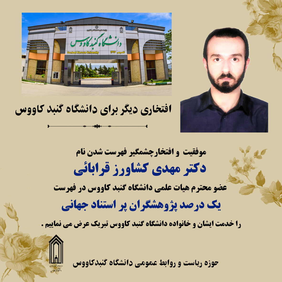 🔰موفقیت و افتخارچشمگیر فهرست شدن نام دکتر مهدی کشاورز قرابائی عضو محترم هیات علمی دانشگاه گنبد کاووس در فهرست یک درصد پژوهشگران پر استناد جهانی را خدمت ایشان و خانواده دانشگاه گنبد کاووس تبریک عرض می نماییم.