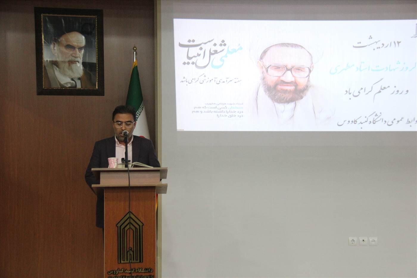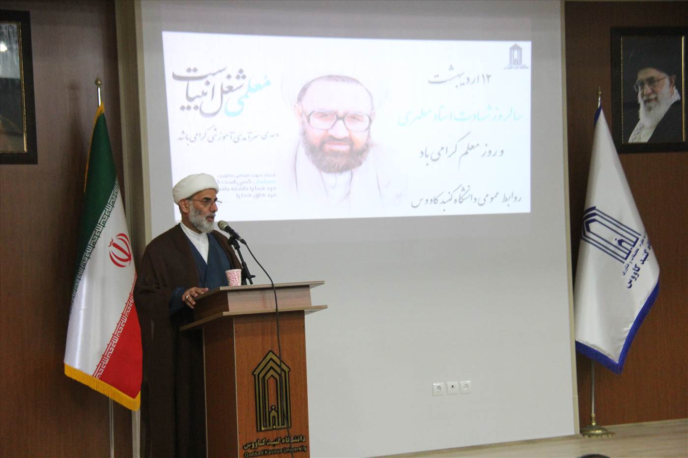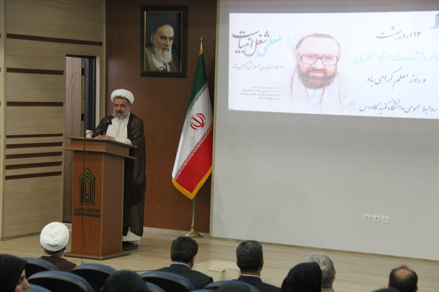 در ادامه حجت الاسلام والمسلمین ترابی امام جمعه محترم شهرستان گنبدکاووس نیز ضمن گرامیداشت روز شهادت استاد مطهری و روز معلم اظهار نمودند که استاد شهید دکتر مرتضی مطهری الگوی تمام عیار و نخبه در حوزههای علمی، فرهنگی و اجتماعی بوده و این امر نیز باعث گردید تا کوردلان منافق تاب این همه فضیلت و فرزانگی را نداشته و ایشان را به شهادت برسانند. ایشان فرمودند ما نیز باید الگو برداری از این شهید بزرگوار را در سرحوله کار خود قرار داده و در جهت رشد علمی و فرهنگی و اعتلای کشور از هیچ تلاش و کوششی دریغ نکنیم .