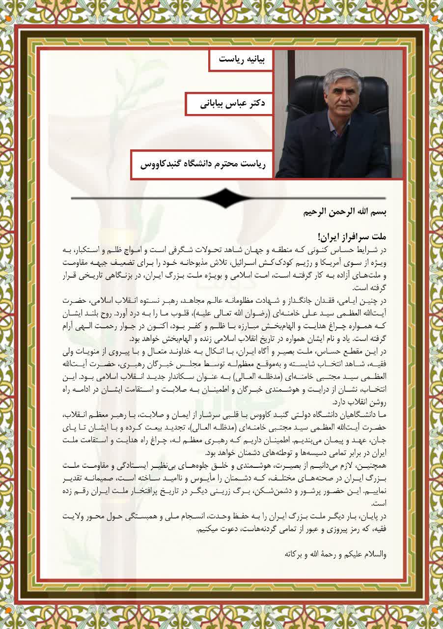 بیانیه رئیس دانشگاه گنبدکاووس در پی تجاوز رژیم سفاک صهیونیستی و آمریکای جنایتکار به خاک میهن و شهادت رهبر فرزانه انقلاب اسلامی